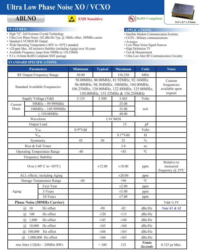 ABRACON旗艦ABLNO系列提供超低相位噪聲固定時鐘或電壓控制晶體振蕩器(VCXO)解決方案標準尺寸為9x14mm。同超過12 kHz的37fs典型RMS抖動20MHz帶寬@ 100MHz載波,ABLNO是性能驅(qū)動的理想選擇通訊,射頻,無線回程,和儀器應(yīng)用。