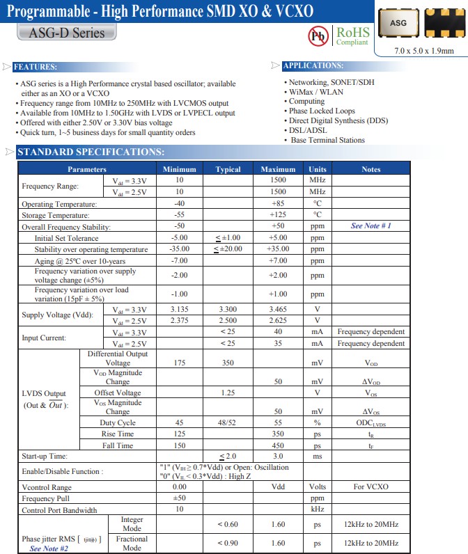 差分晶振具有低電平,低抖動(dòng),低功耗等特性。差分晶振作為目前行業(yè)中高要求、高技術(shù)石英晶體振蕩器,具有相位低、損耗低的特點(diǎn)。因此也被稱之為"低抖動(dòng)振蕩器,低抖動(dòng)石英晶振,低相位晶振,低損耗晶振”。艾博康晶振,差分晶振,ASG-D-V-A-1.000GHZ晶振