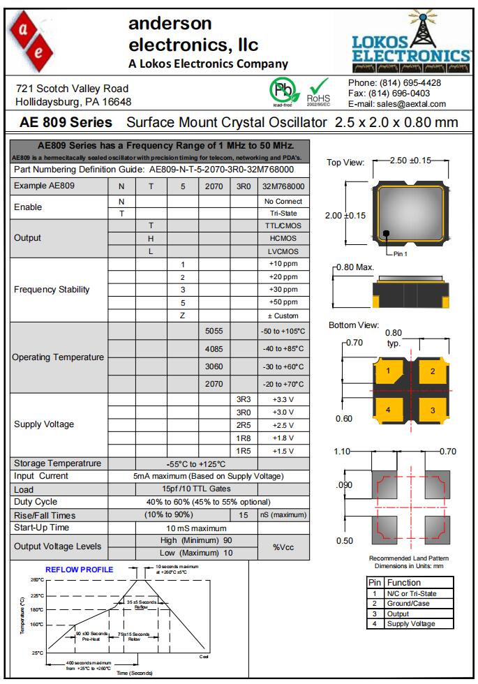 安德森晶振|AE809-N-T-2-4085-3R3-32M768000|2520mm振蕩器規(guī)格表