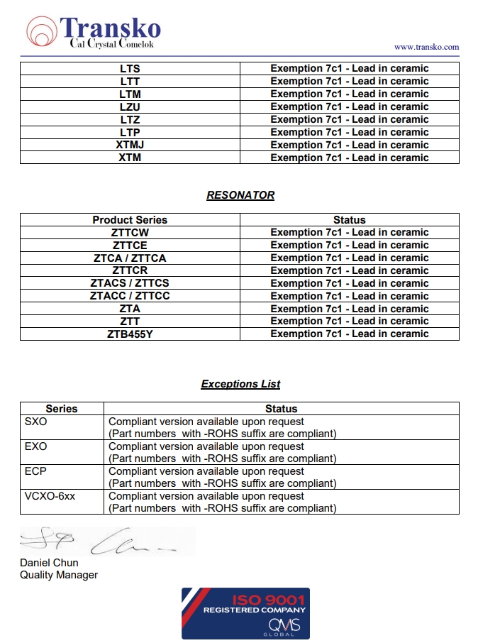 Transko Electronics, Inc.是一家領(lǐng)先的ISO 9001認(rèn)證的電子行業(yè)頻率控制產(chǎn)品制造商,實施質(zhì)量體系已滿足國家和國際質(zhì)量體系的要求的需要。一直以來,Transko晶振的質(zhì)量體系都持續(xù)符合ISO 9001的要求并不斷提高質(zhì)量管理體系的有效性。提供優(yōu)質(zhì)的產(chǎn)品和服務(wù)是Transko Electronics, Inc.的既定政策,始終如一地滿足客戶的需求,實現(xiàn)了領(lǐng)先同行的高質(zhì)量環(huán)保生產(chǎn)標(biāo)準(zhǔn)。