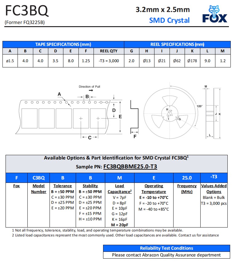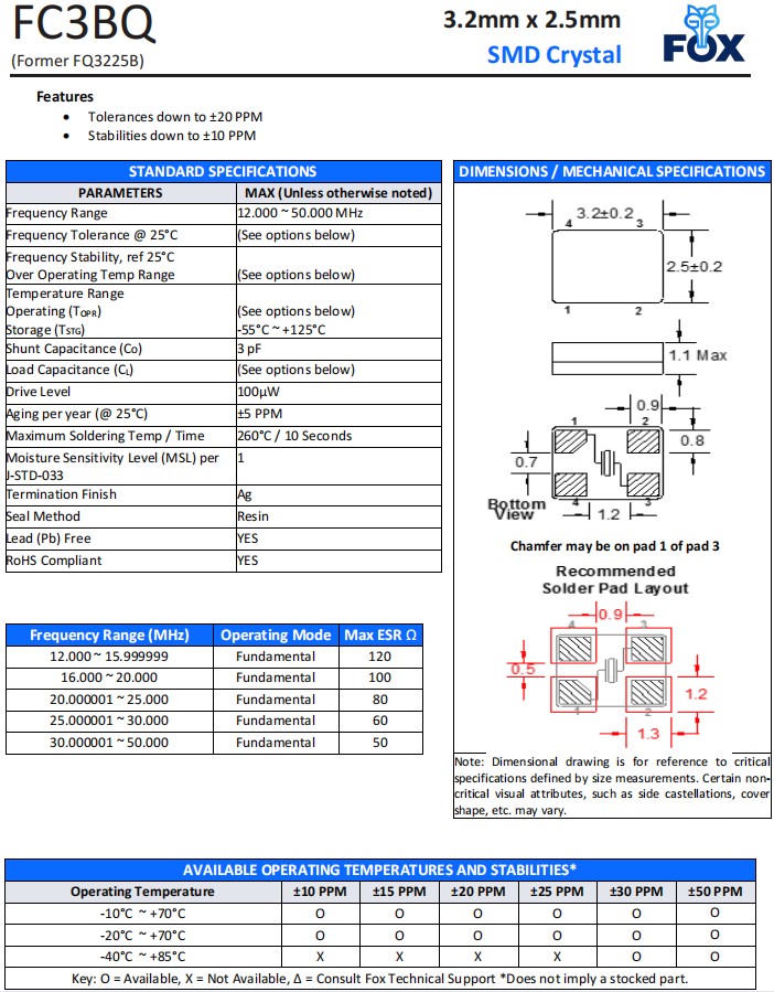 FC3BQBBME16.0-T1,FOX超小型晶振,3225mm石英晶體,安防設(shè)備晶振,規(guī)格表