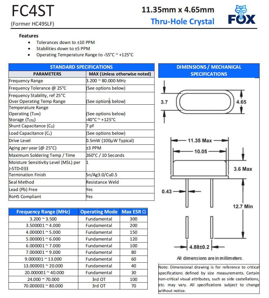 | FC4STCBMF4.9152 | Fox 晶振 | C4ST | 4.9152 MHz | ±50ppm | ±30ppm | 20pF | -20°C ~ 70°C |