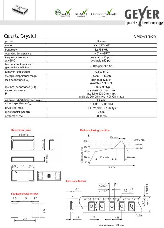 GEYER格耶晶振,KX-327NHT兩腳晶振,SMD晶振,32.768K時(shí)鐘晶體具有小型,薄型,輕型的貼片晶振,,貼片型表面音叉型晶體振蕩器,產(chǎn)品具有優(yōu)良的耐熱性,耐環(huán)境特性,可發(fā)揮晶振優(yōu)良的電氣特性,符合RoHS規(guī)定,滿(mǎn)足無(wú)鉛焊接的高溫回流溫度曲線(xiàn)要求,金屬外殼的封裝使得產(chǎn)品在封裝時(shí)能發(fā)揮比陶瓷振蕩器外殼更好的耐沖擊性.