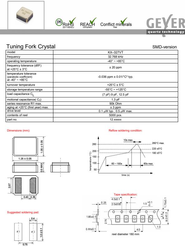 德國格耶晶振,KX-327VT無源晶體,超小型晶振,貼片表晶32.768K系列具有超小型,薄型,質(zhì)地輕的表面貼片音叉型石英晶體振蕩器,晶振產(chǎn)品本身具備優(yōu)良的耐熱性,耐環(huán)境特性,在辦公自動(dòng)化,家電領(lǐng)域,移動(dòng)通信領(lǐng)域可發(fā)揮優(yōu)良的電氣特性,符合無鉛標(biāo)準(zhǔn),滿足無鉛焊接的回流溫度曲線要求,金屬外殼的石英晶振使得產(chǎn)品在封裝時(shí)能發(fā)揮比陶瓷晶振外殼更好的耐沖擊性能.