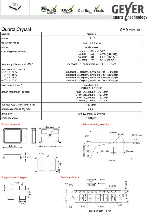 standard -20° ~ + 70°C available -40° ~ + 85°C (=KX-5T) available -40° ~ + 105°C (=KX-5E) available -40° ~ + 125°C (=KX-5F) |