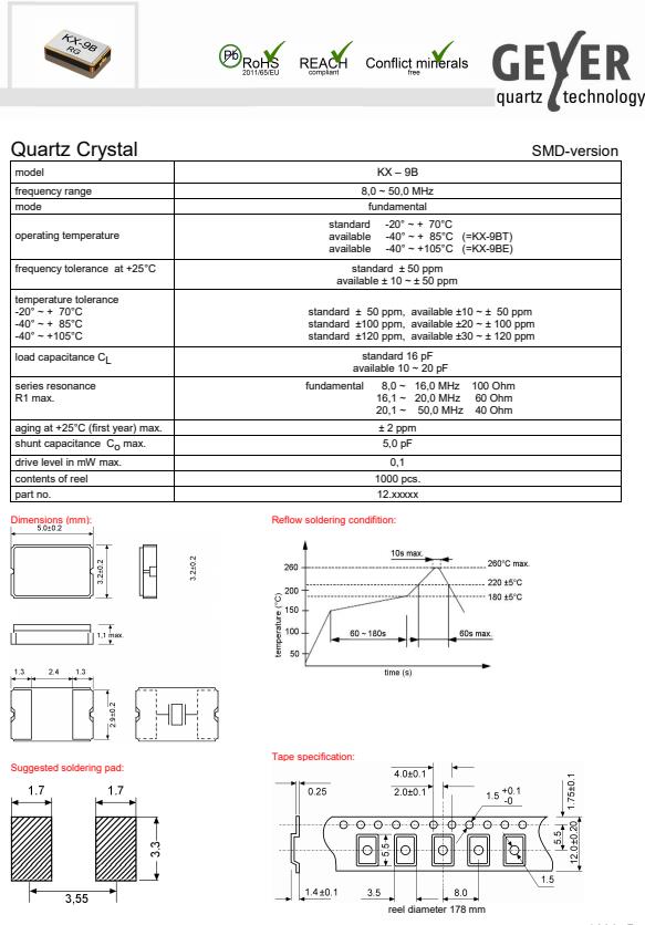 GEYER歐美晶振,KX-9B兩腳晶振,低損耗晶振,小型表面貼片晶振型,是標準的石英晶體振蕩器,適用于寬溫范圍的電子數(shù)碼產(chǎn)品,家電電器及MP3,MP4,播放器,單片機等領域.可對應8.000MHz以上的頻率,在電子數(shù)碼產(chǎn)品,以及家電相關電器領域里面發(fā)揮優(yōu)良的電氣特性,滿足無鉛焊接的回流溫度曲線要求.