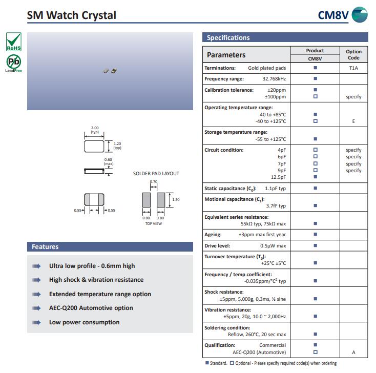 Golledge晶振,CM8V晶振,2012二腳晶振此款SMD晶體并且可以承受回流焊接的高溫,波峰焊接,回流焊接等,貼片表晶主要特點(diǎn)是該產(chǎn)品排帶包裝,焊接模式主要使用SMT焊接,給現(xiàn)代SMT工藝帶來高速的工作效率,32.768K系列產(chǎn)品本身具有體積小,厚度薄,重量輕等特點(diǎn),此音叉型石英晶體諧振器,晶振產(chǎn)品本身具備優(yōu)良的耐熱性,耐環(huán)境特性,在辦公自動化,家電領(lǐng)域,移動通信領(lǐng)域可發(fā)揮優(yōu)良的電氣特性,符合無鉛標(biāo)準(zhǔn),滿足無鉛焊接的回流溫度曲線要求,金屬外殼的石英晶振使得產(chǎn)品在封裝時能發(fā)揮比陶瓷晶振外殼更好的耐沖擊性能.