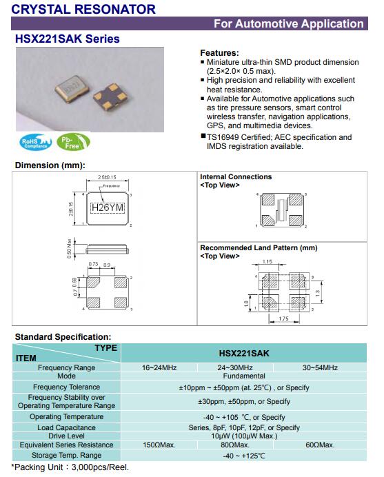 更多>>加高晶振,HSX221SAK晶振,2520小體積晶振