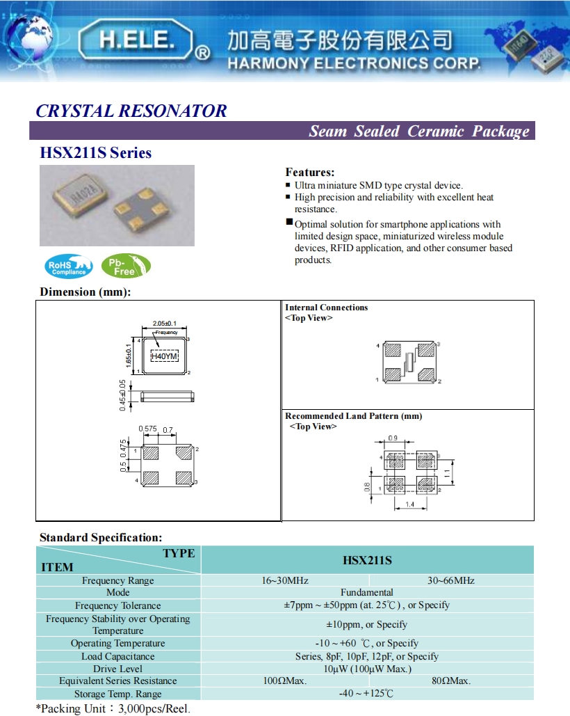 | X2C021000BA1HA-U | HELE晶振 | HSX211S | 21MHz | 10pF | ±10PPM | ±20PPM |