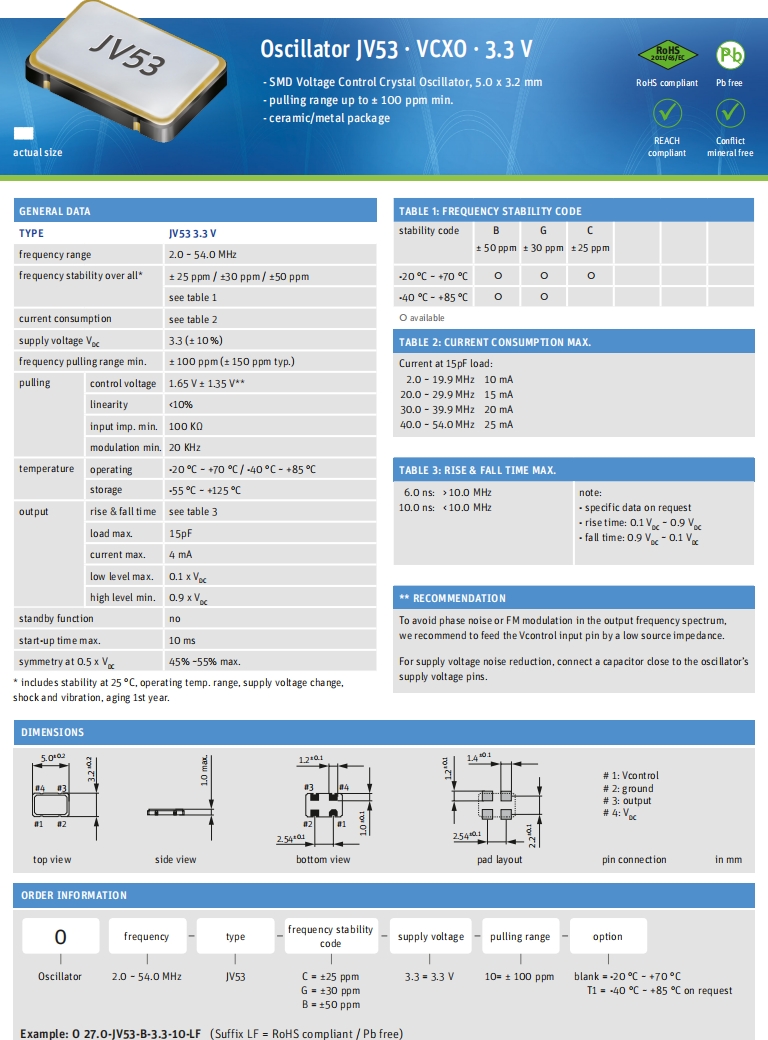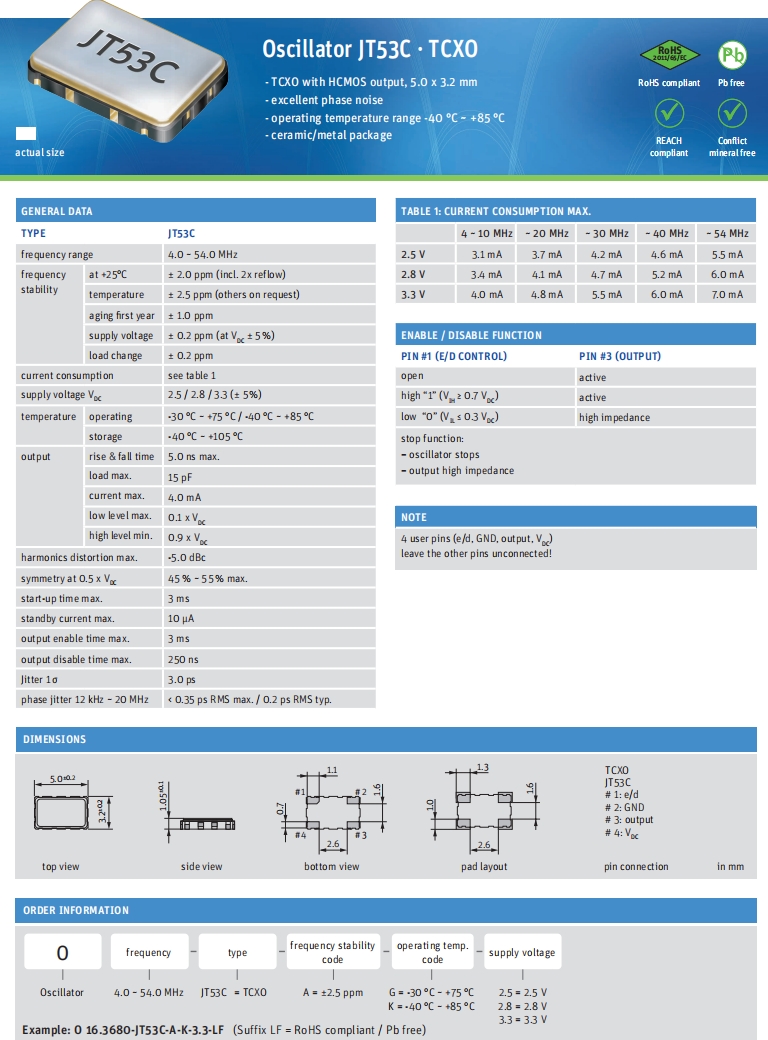 Jauch溫補(bǔ)晶振,O 26.0-JT53C-A-G-3.3-LF,6G移動(dòng)無線電晶振規(guī)格表