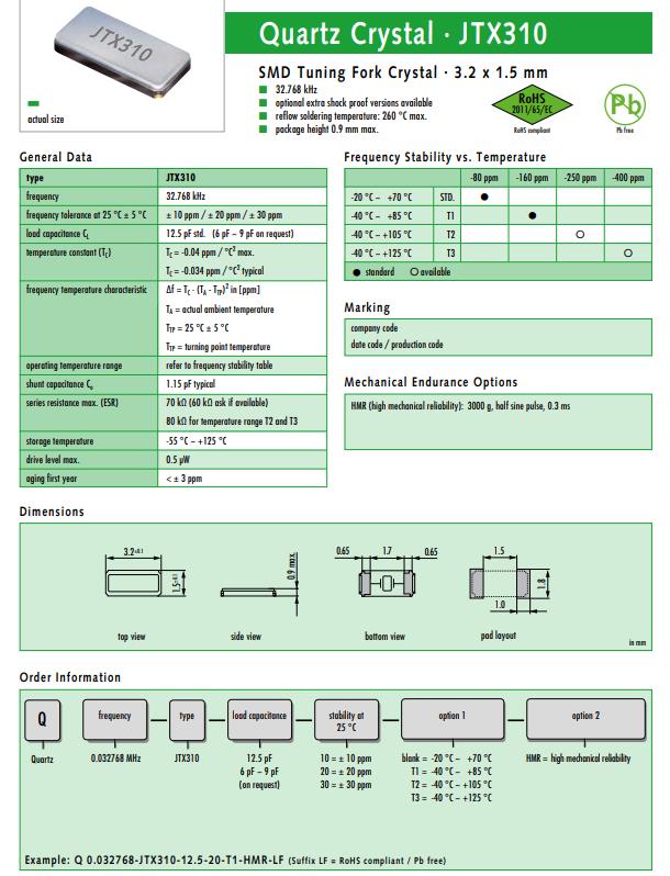 | Q 0.032768-JTX310-12.5-20-T2-HMR-LF | JTX310 | 32.768kHz | ±20ppm | 12.5pF |