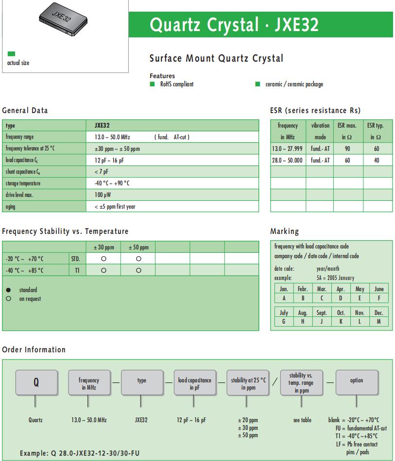 Q 38.0-JXE32-16-20/30-T1-Jauch品牌-6G無線通信晶振,歐美進口晶振,Jauch晶振,JXE32石英晶振,Q 38.0-JXE32-16-20/30-T1晶振,陶瓷諧振器,3225mm晶振,四腳貼片晶振,頻率38MHz,負載16pF,工作溫度-40~85°C,頻率穩(wěn)定性30ppm,無鉛環(huán)保晶振,高可靠性晶振,低電阻晶振,6G無線通信晶振,便攜式多媒體設(shè)備晶振,微處理器時鐘晶振,可穿戴設(shè)備晶振.