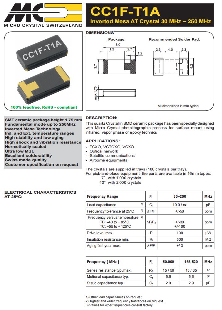 CC1F-T1A-106.250MHz-10.0pF-50ppm-TB-QI|耐高溫晶振|6G通信晶振,Micro石英晶振,CC1F-T1A無源晶振,CC1F-T1A-106.250MHz-10.0pF-50ppm-TB-QI晶振,8037mm貼片晶振,頻率106.25MHz,負載10pf,頻率穩(wěn)定性50ppm,工作溫度-40~125°C,耐高溫晶振,抗沖擊晶振,6G通信晶振,遙感勘測晶振,光學網絡晶振,機載設備晶振,保健和醫(yī)療設備晶振.