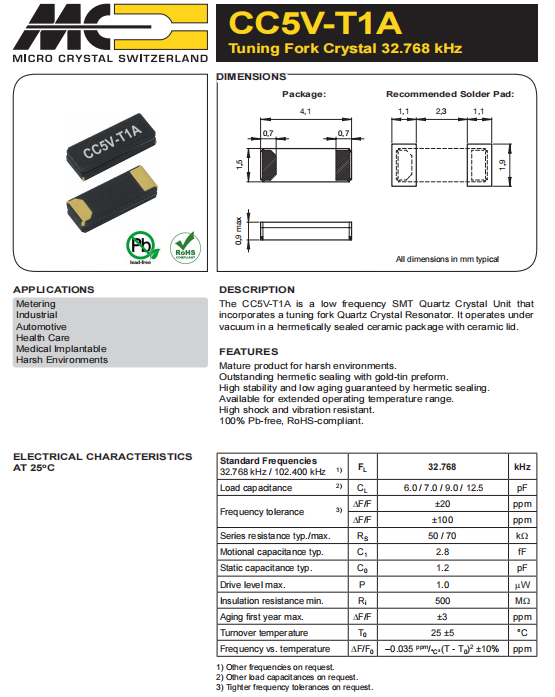 CC5V-T1A-32.768kHz-7pF-20PPM-TA-QC,4115mm,6G模塊晶振,歐美微晶晶振,型號(hào)CC5V-T1A,是一個(gè)低頻SMT石英晶體單元,包含一個(gè)音叉石英晶體諧振器,編碼CC5V-T1A-32.768kHz-7pF-20PPM-TA-QC,頻率32.768KHz,負(fù)載7pf,尺寸4115mm,工作溫度-40~85°C,適用于惡劣環(huán)境的成熟產(chǎn)品,具有高抗沖擊和抗振動(dòng)性,6G模塊晶振,工業(yè)應(yīng)用晶振,測(cè)試與測(cè)量設(shè)備晶振,汽車電子設(shè)備晶振.