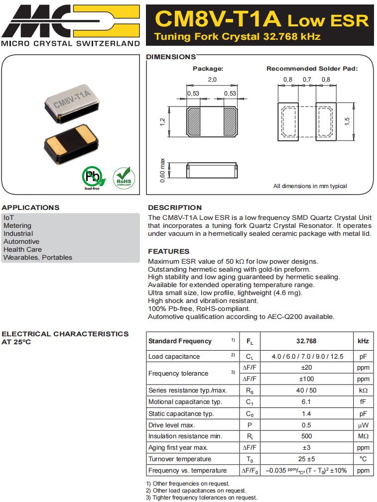 | CM7V-T1A-Low-ESR-32.768k-7pF-10-TB-QA | Micro Crystal | 晶體 32.768 kHz 7.0 pF +/-10 PPM LOW ESR |
