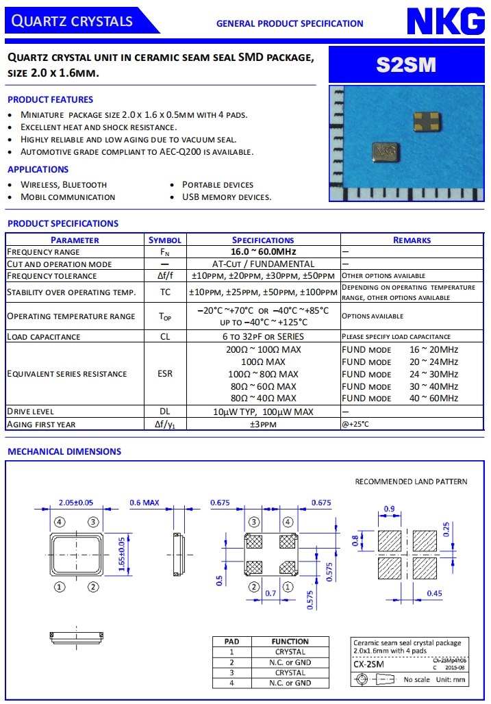 NKG Crystal|S2SM20.000F20M23-EXT|2016mm石英晶振規(guī)格表