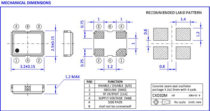 ●SMD封裝尺寸為3.2 x 2.5 x 1.2mm,帶有4個(gè)襯墊