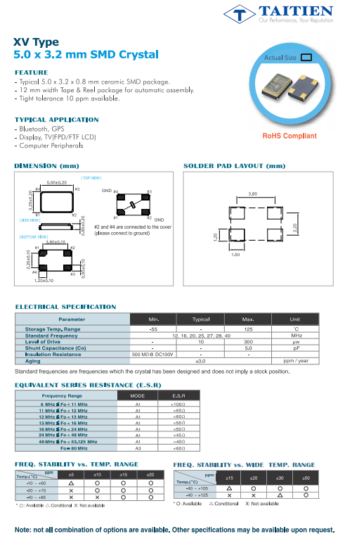 XVHCELNANF-8.000000-8MHz-30PPM-5032--40~85℃-TAITIEN,臺(tái)灣進(jìn)口石英晶振,典型的5.0 x 3.2 x 0.8 mm陶瓷SMD封裝。- 12 mm寬的膠帶和卷軸包裝,用于自動(dòng)組裝。-緊密公差10 ppm可用,藍(lán)牙、GPS顯示器、電視(FPD/FTF LCD),計(jì)算機(jī)外圍設(shè)備