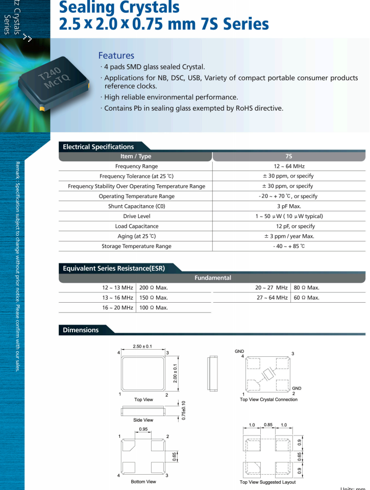 TXC|7S-18.432MAHE-T|18.432MHz|2520|-40~85℃|30PPM,臺(tái)灣進(jìn)口石英晶振,SMD玻璃密封晶體2.5 x 2.0 x 0.75 mm 7S系列。4墊SMD玻璃密封晶體。適用于NB、DSC、USB、各種緊湊型便攜式消費(fèi)品參考時(shí)鐘。高可靠的環(huán)境性能。在被RoHS指令豁免的密封玻璃中含有鉛。