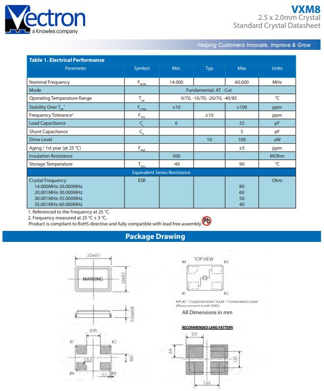 更多>>維管石英晶體,VXM8晶振,2520四腳晶振