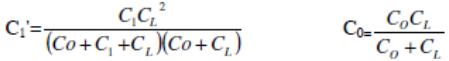 因此,振蕩頻率是由石英諧振器的壓電常量以及振蕩電路中配置的負(fù)載電容決定的(工作溫度以及驅(qū)動能力分別指定),所以振蕩電路的負(fù)載電容必須定義清楚.石英諧振器于串聯(lián)負(fù)載電容CL的等效電路如圖-7所示,此時(shí)常數(shù)為: