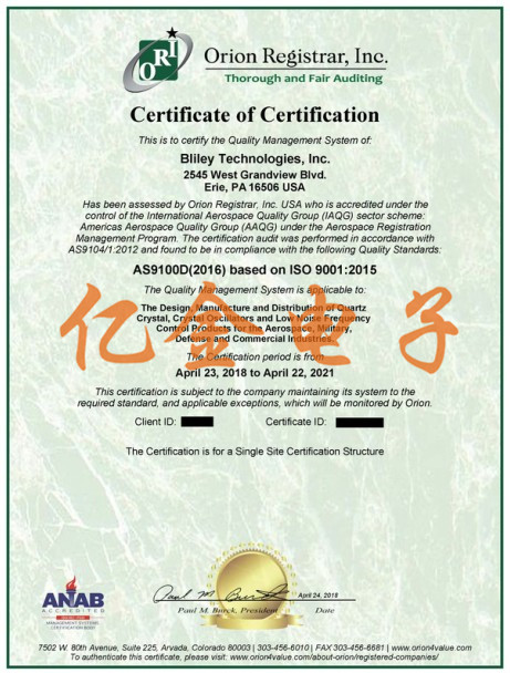 Bliley晶振的Erie工廠于2018年2月獲得認(rèn)證,展示了完全記錄并實(shí)施的質(zhì)量管理體系,該體系已通過(guò)AS9100:2016標(biāo)準(zhǔn)認(rèn)證.