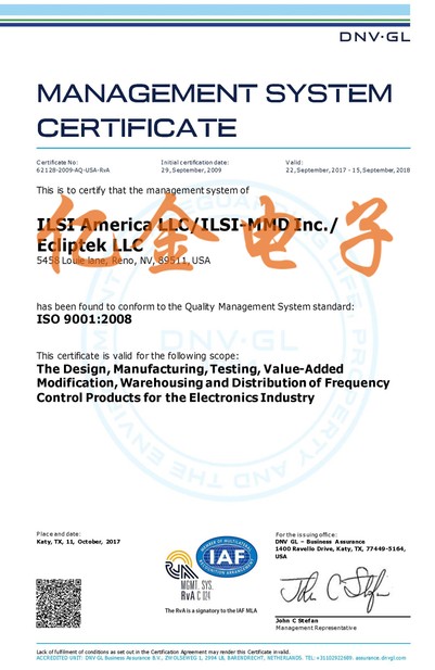 日蝕晶振獲2018年ISO9001國際質(zhì)量保證書