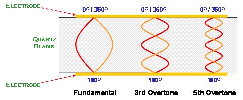 在AT切割角度的石英晶體共振子主要是以厚度剪切振蕩模態(tài)存在. 石英晶體在共振時(shí), 除了基本波振蕩之外, 高階的倍頻共振也與基本波振蕩同時(shí)存在于石英晶體的電極區(qū)域之間. 但是, 由于壓電材料的電極是電氣相位相反的振動(dòng)環(huán)境, 所以, 祇有奇數(shù)倍(odd number)的高頻倍頻可以發(fā)生, 偶數(shù)倍(even number)的倍頻共振在石英晶體共振子是不會(huì)存在的(左圖).