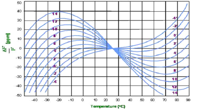 以AT切割角度變動(dòng)在厚度振動(dòng)模態(tài)的頻率對(duì)溫度特性的展開(kāi)圖. 圖中以常用的室溫?cái)z式25度作為相對(duì)零點(diǎn), AT切割的最大優(yōu)點(diǎn)是頻率對(duì)溫度變化為一元三次方曲線. 這個(gè)特性, 從(左圖)中可以看到, 在相當(dāng)寬廣的溫度范圍下, AT切割的溫度曲線的第一階及第二階常數(shù)為零, 第三階的常數(shù)便決定了頻率對(duì)溫度的變化值.