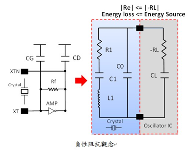 石英晶體共振子的兩端往振蕩電路看過去,排除共振子以外的所有阻抗特性質(zhì)總和,振蕩電路上必須提供足夠大的增益來補償共振子共振時的機械能損耗,也就是放大器為一個能量源,若負性阻抗的能量源大于振蕩電路的損耗時,能源回路為平衡狀態(tài)此回路為穩(wěn)定振蕩,負性阻抗不是產(chǎn)品規(guī)格參數(shù),但卻是振蕩線路設計時很重要的性能指針.