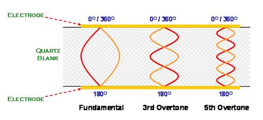基本波振蕩及倍頻振蕩模態(tài)( Fundamental and Overtone Vibrations Mode)在AT切割角度的石英晶體共振子主要是以厚度剪切振蕩模態(tài)存在. 石英晶體在共振時(shí), 除了基本波振蕩之外, 高階的倍頻共振也與基本波振蕩同時(shí)存在于石英晶體的電極區(qū)域之間. 但是, 由于壓電材料的電極是電氣相位相反的振動(dòng)環(huán)境, 所以, 祇有奇數(shù)倍(odd number)的高頻倍頻可以發(fā)生, 偶數(shù)倍(even number)的倍頻共振在石英晶體共振子是不會(huì)存在的(如左圖).