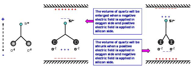 石英是由硅原子和氧原子組合而成的二氧化硅(Silicon Dioxide, SiO2), 以32點群的六方晶系形成的單結(jié)晶結(jié)構(gòu).單結(jié)晶的石英晶體結(jié)構(gòu)具有壓電效應(yīng)特性, 當(dāng)施加壓力在晶體某些方向時, 垂直施力的方向就會產(chǎn)生電氣電位. 相對的當(dāng)以一個電場施加在石英晶體某些軸向時, 在另一些方向就會產(chǎn)生變形或振動現(xiàn)象. 掌握單結(jié)晶石英材料的這種壓電效應(yīng), 利用其發(fā)生共振頻率的特性, 發(fā)揮其精確程度作為各類型頻率信號的參考基準(zhǔn), 就是水晶震蕩器的設(shè)計與應(yīng)用. 因為石英晶體具有很高的材料Q值,所以絕大部份的頻率控制組件,如共振子及振蕩器,都以石英材料為基礎(chǔ). 以石英為基礎(chǔ)的頻率控制組件可以依其壓電振動的屬性, 可以分為體波(bulk wave)振動組件及表面聲波(surface acoustic wave)振動組件. 體波振動組件如石英晶體共振子, 石英晶體濾波器及石英晶體振蕩器, 表面波振動組件如表面波濾波器及表面波共振子.