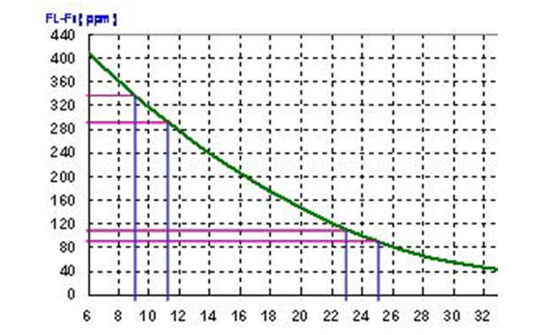 (左圖中)CL=24 pF 時(shí)的頻率敏感度是10 ppm/pF, 及CL=10 pF時(shí)的頻率敏感度是20 ppm/pF. 在并聯(lián)線路中, 負(fù)載電容越小, 頻率對(duì)負(fù)載電容變化的敏感度越高. 相反的, 負(fù)載電容越大, 頻率對(duì)負(fù)載電容變化的敏感度越低. 這就是石英晶體共振子用于VCXO線路上時(shí), 線路設(shè)計(jì)上會(huì)選用較小負(fù)載電容. 反之, 在要求較準(zhǔn)確的頻率信號(hào)時(shí), 線路設(shè)計(jì)上會(huì)選用較高的負(fù)載電容.