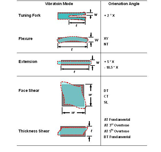 經(jīng)由不同的石英切割角度及不同電極型狀的電場效應(yīng), 石英芯片展現(xiàn)了各種不同的振動(dòng)模態(tài). 以經(jīng)常產(chǎn)生的振動(dòng)模態(tài)可以概分為擾曲模態(tài)(flexure mode), 伸縮模態(tài)(extension mode), 面剪切模態(tài)(face shear mode) 和 厚度剪切模態(tài)(thickness shear mode). 這幾種振動(dòng)模態(tài)以簡單的方法在表一中可以看到. 在實(shí)際狀況中, 石英芯片并不是一定祇有單一種振動(dòng)模態(tài), 而可能有多種模態(tài)同時(shí)存在在一個(gè)石英芯片的振蕩中, 經(jīng)由適當(dāng)?shù)脑O(shè)計(jì), 可以壓制其它不希望產(chǎn)生的振動(dòng)模態(tài)(unwanted mode), 來達(dá)到主要振動(dòng)模態(tài)的最佳化.