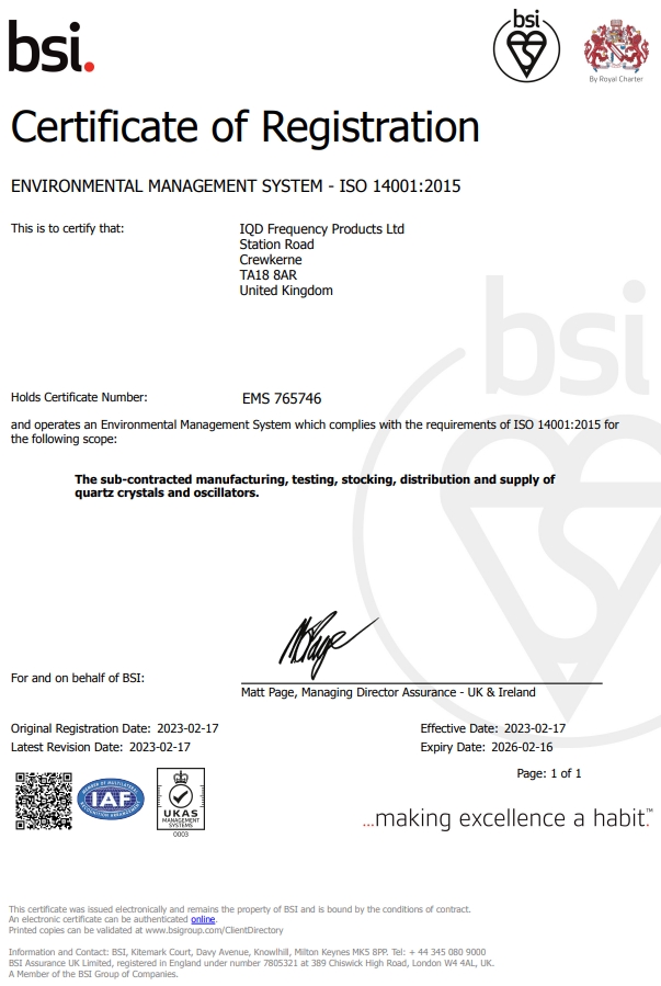最初于1988年獲得BS 5750認(rèn)證,IQD所有的設(shè)計、制造和測試設(shè)施都通過了ISO 9001:2015認(rèn)證。我們的質(zhì)量管理體系不斷改進(jìn)和調(diào)整,以滿足國際標(biāo)準(zhǔn)和客戶的要求。 質(zhì)量是IQD晶振成功的基石,我們?yōu)槲覀兊囊幌盗蓄l率控制產(chǎn)品提供全面的質(zhì)量解決方案。我們的質(zhì)量管理體系確立了適當(dāng)?shù)睦砟?,以確保公司及其員工遵守文件規(guī)定的程序,并通過提供高度誠信的產(chǎn)品和服務(wù)來保持客戶滿意度。