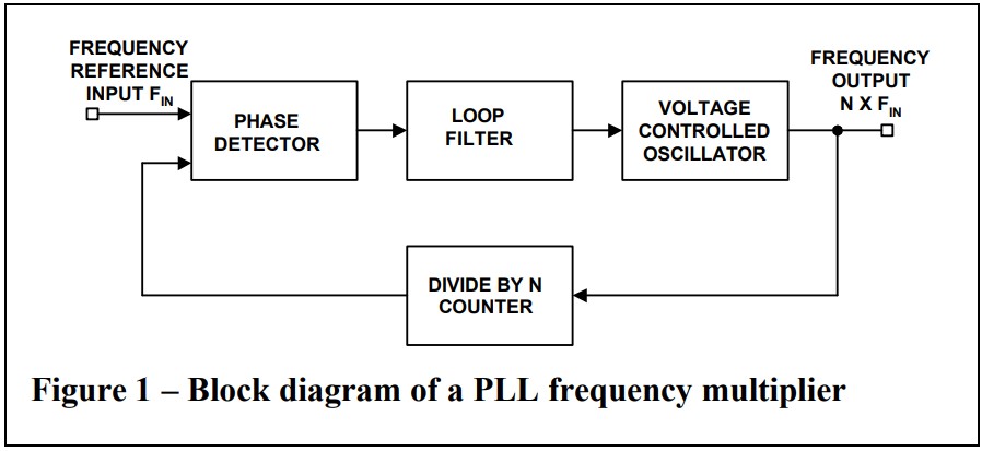 圖1包含一個(gè)模塊基本PLL示意圖倍頻器。這該電路的操作是典型的全鎖相循環(huán)。這基本上是一種反饋控制系統(tǒng)控制電壓控制的相位貼片振蕩器(VCO)。輸入信號(hào)施加到一個(gè)輸入端相位檢測(cè)器。其他的輸入連接到N分頻的輸出 柜臺(tái)。通常情況下 兩個(gè)信號(hào)的頻率將 幾乎一樣。這鑒相器的輸出為 與電壓成比例的電壓 之間的相位差兩個(gè)輸入。這個(gè)信號(hào)是應(yīng)用于環(huán)路濾波器。它是環(huán)路濾波器決定的動(dòng)態(tài)特征 鎖相環(huán)。濾波后的信號(hào)控制VCO。注意到VCO的輸出為a N倍的頻率提供給的輸入頻率參考輸入。