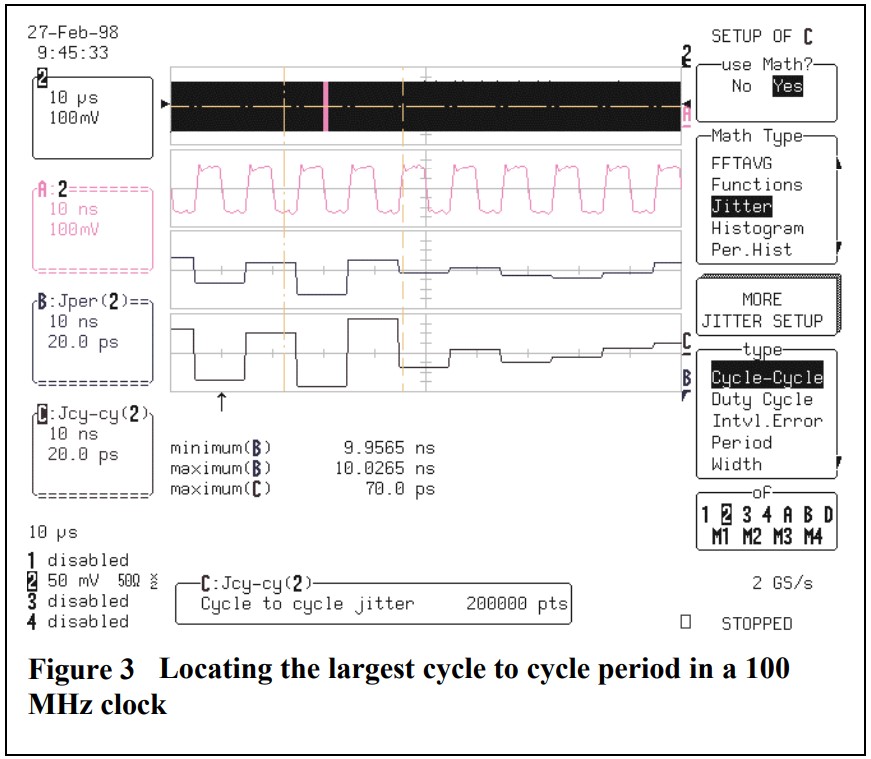 工程師可以 驗(yàn)證系統(tǒng)時(shí)鐘通過以下方式滿足本規(guī)范 測(cè)量系統(tǒng)時(shí)鐘 使用抖動(dòng)跟蹤循環(huán)來循環(huán)。 這如圖3所示。 在100 us記錄中最大循環(huán)周期 差70 ps。這個(gè)值 是直接從抖動(dòng)跟蹤周期到周期 軌跡c中的波形。該區(qū)域 在垂直參數(shù)之間 光標(biāo)標(biāo)記最大值。 跡線A是 采集的數(shù)據(jù)并顯示 兩個(gè)相鄰的循環(huán)最大差異。 軌跡B是抖動(dòng)軌跡讀取絕對(duì)值的周期 的每個(gè)周期的周期 時(shí)鐘波形。貼片石英晶振