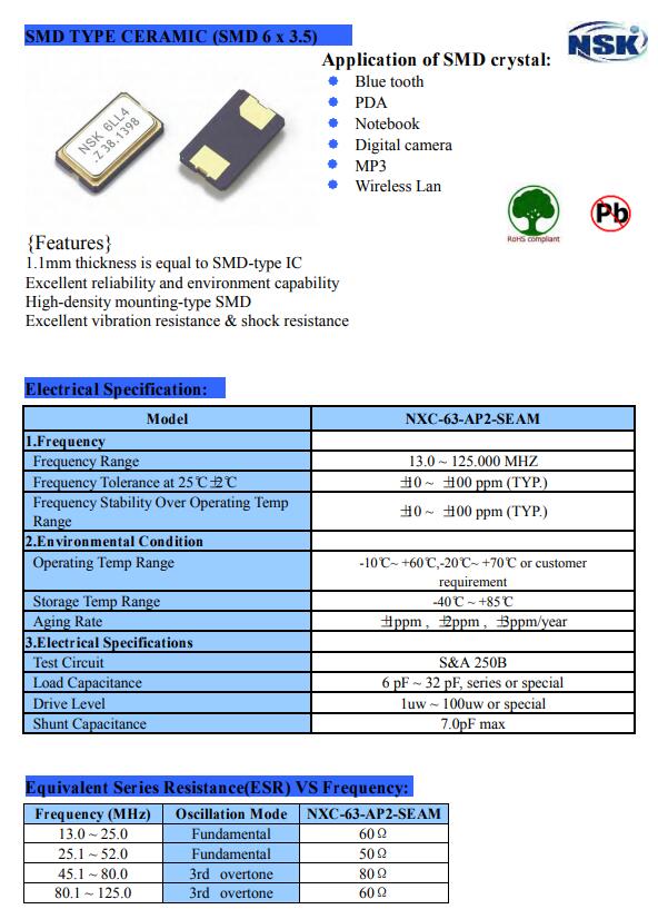 臺(tái)灣津綻晶振,NXC-63-AP2-SEAM晶振,6035二腳晶振臺(tái)灣津綻大陸代理,6035封裝,超小型表面貼片型SMD晶振型號(hào),最適合使用在汽車(chē)電子領(lǐng)域中,也是特別要求高可靠性的引擎控制用CPU的時(shí)鐘部分.低頻晶振可從7.98MHz起對(duì)應(yīng),小型,超薄型具備強(qiáng)防焊裂性,NSK英晶體在極端嚴(yán)酷的環(huán)境條件下也能發(fā)揮穩(wěn)定的起振特性,產(chǎn)品本身具有耐熱,耐振,耐撞擊等優(yōu)良的耐環(huán)境特性,滿(mǎn)足無(wú)鉛焊接以及高溫回流溫度曲線要求,符合AEC-Q200標(biāo)準(zhǔn).