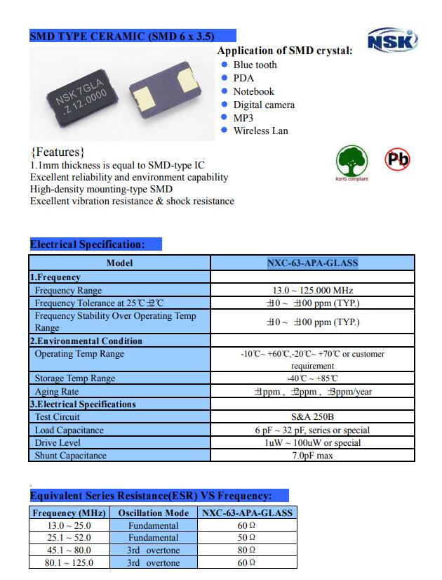 津綻晶振,NXC-63-APA-GLASS晶振,6035二腳晶振貼片晶振本身體積小,超薄型石英晶體諧振器,特別適用于有目前高速發(fā)展的高端電子數(shù)碼產品,因為晶振本身小型化需求的市場領域,小型?薄型是對應陶瓷諧振器(偏差大)和普通的石英晶體諧振器(偏差?。┑闹虚g領域的一種性價比較出色的產品.產品廣泛用于筆記本電腦,無線電話,衛(wèi)星導航HDD, SSD, USB, Blu-ray等用途,符合無鉛焊接的高溫回流焊曲線特性.